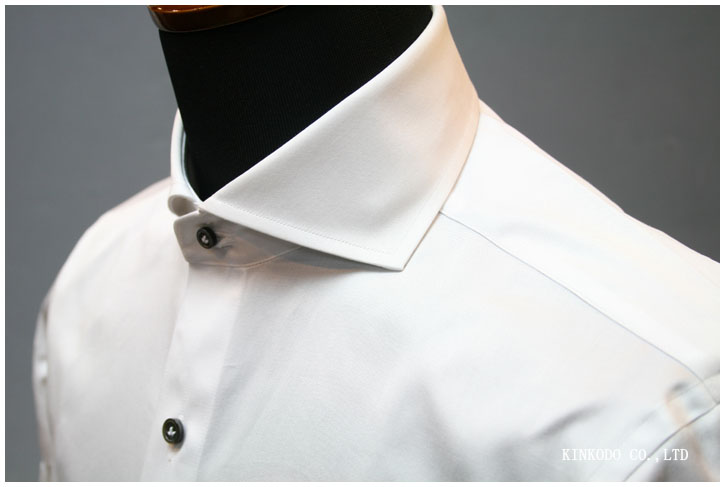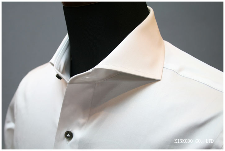 ワイドよりも広がりが強く、基本ネクタイを外して着用して頂きたい衿型。第一ボタンを外すと、衿先が後ろの方にいくので、綺麗に広がります。このシャツの生地はトーマスメイソンの硬めの生地を使っていますが、硬めの生地ではなくとも、ある程度このように綺麗に衿が立つのが特徴。