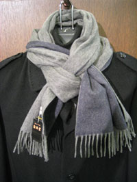 それで当店のマフラーも真似して巻いてみました。巻いたマフラーは170センチ×35センチというかなり大判なものですが、この巻き方ですと、これでも