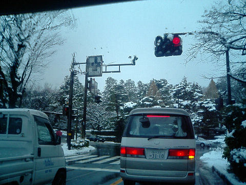 写真は兼六園前の信号待ちで、雪の降る街を暖かい車の中から撮影したものです。