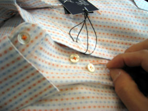 写真の商品オリジナルのカジュアルシャツ、オレンジ色の生地にオレンジ色の釦付け糸、新しい商品が生まれる時も素敵な気分になります。