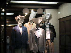 スランプから立ち直った訳ではないのですが、先日のディスプレイにインパクトをと人体上部に英字新聞で顔を作ってみました。決して新しい手法ではなく、何年も前にも一度やったことがあるのですが、その時は結構評判が良かったので。