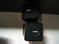 そのお店では確か片チャンネル4つのキューブだったと思いますが、私は片チャンネル2つのキューブそれが左右2組とサブウーハーです。自宅を建てる時に壁に配線をしてもらい、壁から線を出し、奥の天井からも二本の線を垂らしてもらい、そこに背面から音が聞こえるように別のBOSEを2機ぶら下げております。