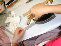 ヨークのネーム、剣ボロ(袖元の割れ目を補強する2枚の布:写真)、ポケットなどの細かい作業を必要とする部分は、一枚一枚アイロンで丁寧に折り目をつけ、のり入れが施されます。ポケットサイズや形状など、注文伝票を見ながら折っていきます。