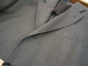 洋服のスタイルがこれだけ多様化していることも珍しいことだと思います。ダブルこそ比率はずいぶん減りましたが、洋服のジャケットのスタイルを見るとありとあり得るスタイルがあります。二つボタン、三つボタン、三つボタンの段返り、衿幅も広いのもあれば、狭くてゴージの高いもの、シングルなのにピークラベル、センターベンツもあればノーベンツ、そしてサイドベンツ、スラクスのスタイルにしても裾はダブルもあればシングルも。どれが流行かどのスタイルで着るべきかは、全体のバランスをみないとなんとも言えないところでもあります。【写真のジャケットは三つボタンの段返り、一番上のボタンはラベルの裏側に隠れるようなスタイルでボタンをかけることはありません。】