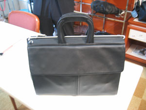 メンズバッグ。こちらはコレクションの中でも一番大きくプライスもそれなりでしたが、中の仕様と、そして開け口に金具を使っているのですが、それは特許をとっているとか。写真ではちょっとその金具が分かりづらいのが残念ですが。