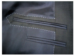 写真のように、内ポケットの部分。裏地ではなくて表地がせり出しているように仕立ててありますが、これをお台場と言います。手の込んだ仕様ですので、オーダーなどではオプション扱いになる場合もあります。裏にもこだわるというところでしょうか?