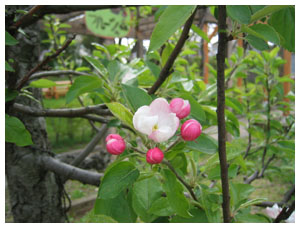 写真はりんごの花。子供の通う小学校に咲いていました。