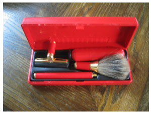 今日自宅の洗面の下を覗くと、真っ赤な小さなボックスが出てきました。4センチ×11.5センチ高さが2センチほどのプラスティックの箱ですが、中を開けるとシェービングセットが。最近はどこに旅行をしてもホテルには色々なものが揃っていてできるだけ簡単に旅行ができるようになっています。便利になるのはいいのですが、情緒もなくなることもありますね。昔は需要も結構あって当店でもメンズのグルーミングキットのようなものを結構扱っていました。