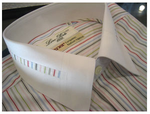 プリンターが壊れたり、色々とありましたのですみません。タイトルの「シャツの傾向と対策」これはお客様ではなくて売る方(当店)の方でありまして、写真のシャツ。こちらは比較的派手目なシャツですが、身頃にはオーストリアのゲッツナー社のマルチストライプのシャツ生地。そしてそれをクレリックにして、白の衿に身頃のストライプの生地を貼り付け、そして衿先にはまた白の生地を合わせて処理をしたシャツです。