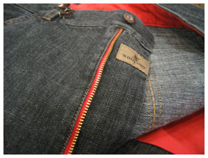 こちらのジーンズはシルエットはオーソドックスなストレート。シルエット自体は細いことは細いですが、極端に股上が浅い訳ではありません。赤く見えるのは実は裏地。裏地ですので、着用されるとほとんど見えることはありません。ウエスト部分のボタンフォールが赤なのと、フロントジッパーの布の部分が赤ですが、こちらもちらっと見えるくらいです。じゃっかん色気を感ずるところが大人でしょうか?(笑)