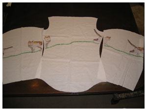 勿論最初にシャツを作る際には型紙を作っています。その型紙をスキャニングし、バラバラになった実際のシャツと照らし合わせながら、スキャニングした型紙とイラストをコンピューター上で合わせてイラストを書く、そのデーターを生地にプリントができるところ(プリント屋さん?)に送り、白い生地にイラストをプリントしてもらう。先生にイラストを書いてもらう時には型紙自体をトレースしてもらい、それにこちらが指示させて頂きました縫い代部分もプラスしてもらいます。