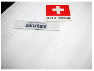 写真の生地。エンブロイダーと言われる生地で、こちらはタキシード用。白の柄がひだ胸の胸の部分にきます。アフター6のパーティーの場合はこのようなシャツでタキシードでもありかと思います。