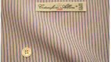衿の形ですが、ワイドで剣先の短いショートです。これも第一ボタン第2ボタンを外した時に小さめの衿ですから納まりもよく、カジュアルなシャツにはぴったりです。生地はイタリアのアルビアーテ社のもの、どちらかと言うと張りとコシがある生地です。