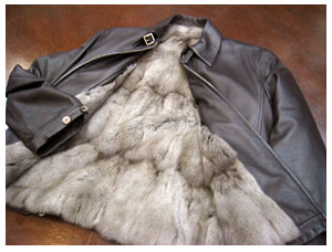 表は鹿革で中は野ねずみの毛皮。そして袖裏はシルクを使っております。こうやって写真で見るといかにもゴージャスと言う感じはしますが、ジッパーを上げてしまうと普通のこげ茶のレザーブルゾンです。