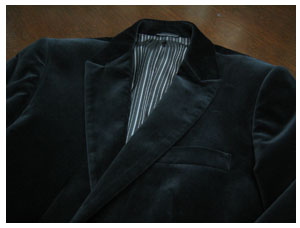 私がチョイスしたのは、ベルベットのシングルのジャケット、ピークラベルがフォーマル感を演出している。ジーンズでのコーディネートはセオリーだが、今日の店にはカジュアルすぎるのでレザーのパンツをセレクトしてみた。