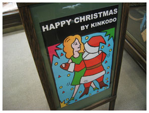 店頭のA型看板もサンタさんに。ただしこちらは大人のサンタです。女性と踊るサンタ。今年は皆さんどんなクリスマスを迎えるのでしょうか?ちなみに今の私はサンタさん信じています。いや信じたいです。ただ一度も来て頂いたことはありません。24日は靴下枕元に置いて10時には寝ますので、是非お願い致します。