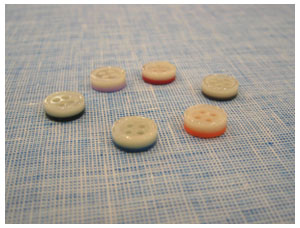 貝ボタンではこのように色を付けることはできませんが、プラスチックだからこそこんなにポップな仕上がりになるのかと思います。ボタンの下の生地はブレンバーナーの麻100%の生地。どうです?楽しそうでしょう。