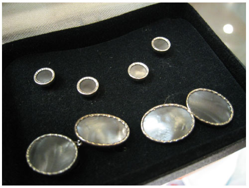 上の写真は黒蝶貝のクラッシックなスタイルのカフスボタンが二つ。チェーンで間を渡している形のものです。その上に同じく黒蝶貝の小さなボタンが4つ。