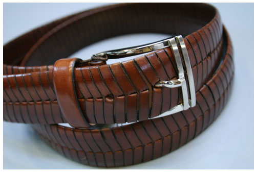 ベルトにも季節感はあります。通常のカーフ素材のものですとオールシーズンになりますが、ちょっと夏を意識してメッシュ調のベルトもお洒落かと思います。革を織り込んで作る贅沢な仕上げですね。イタリー製 BELTS(メーカー名)のベルト ¥36,750-