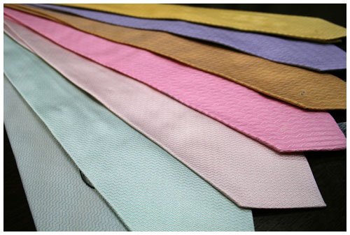 そして、シャツの柄や色にバリエーションが増えましたから、ネクタイは無地のタイですっきり演出、しかもパステル調の色合いで。例えばこんな感じで。
