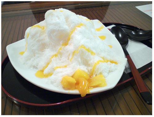 台湾アイス?とどんなアイスか?と思っていってきたのですが、最初はテイクアウトで買ってきてもらうつもりだったのですが、座って食べるようで・・・注文したのが「金銀財宝」マンゴとマンゴソースが乗っておりまして¥600-