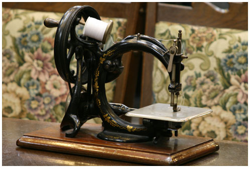 昔のミシンと言えば鉄の塊、しかしこちらは軽いです。これを使っていたかと言うと、こちらは当店の会長が以前に珍しい形だからとどこかで買い求めたもの。これはハンディのミシンとかで、優雅に長期の旅行などに手荷物の一つとして持っていったのではないかと言うことです。船旅の途中でちょっと洋服を直したりする。そんな時に使われたのでは。このミシンの何が珍しいかといいますと、これは持ちやすいようにか、アームの部分が湾曲しております。通常のミシンはこの部分が真っ直ぐになっているものが多いと思いますが、こちらは可愛いスタイルに。