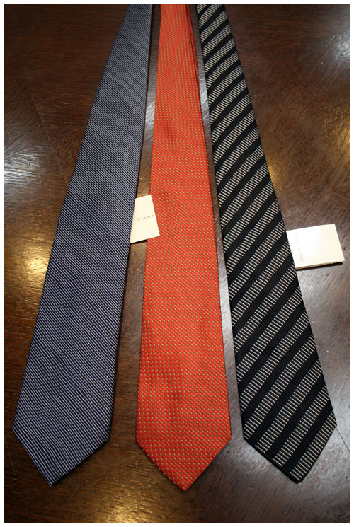 右よりアルマーニ・フェラガモ・ブルガリですが、アルマーニは巾が大剣の先端の巾が9センチ弱、フェラガモで9センチちょっと、ブルガリで約10センチ。これらは仕上げの段階の織り上がりの状態で若干違ってくるのでしょうけど。大検の先の巾の違いよりも大きくネクタイの巾の印象を変えるのが更に上の方にいった所の巾。これはアルマーニはかなり細くなっております。全てのブランドが細くなる訳ではないのでしょうが、スーツのスタイルや衿巾によっても変わってくるのかと思います。