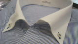 生地はトーマスメイソンの140番手。衿型はロングポイント、お客様より基本の形から更に後ろ衿台の高さや衿の長さなどのご指定、ご指示がありその通りお作りさせて頂いた訳で、オリジナルティの高いシャツになったかと思います。