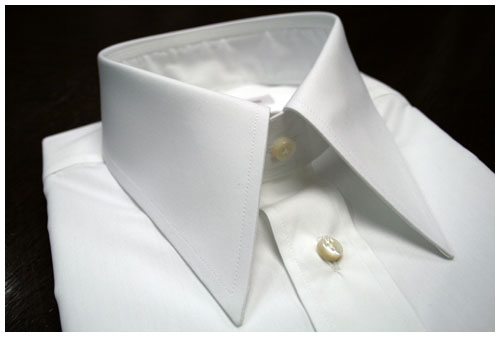 トーマスメイソンの140番手白お仕立て上がり¥26,250- 白蝶貝4つ穴4ミリ厚ボタン(オプション)¥1,575-