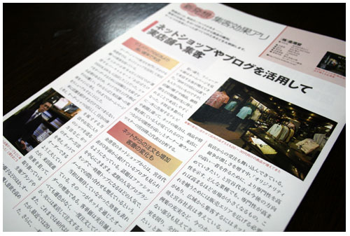 このブログは宣伝か?と言われればそうに違いないと思いますが、少しでもオーダーシャツ屋メンズファッションのことを知って頂きたいと思って書いております(その割にはプライベートなネタが多いということは置いといて)先日当店が出店しておりますショッピングモール「お店ばたけ」を運営するISICO(石川県産業創出支援機構)の情報誌に数あるお店の中から当店を取り上げて頂きました。全12ページ中1ページを割いて。下の写真がちょっとピンボケですが当店を取り上げて有難うございました。