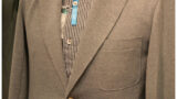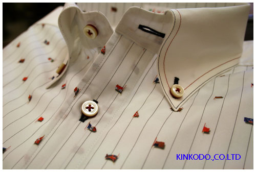 オーダーはオーダーで綺麗なストライプの生地もあるのですが、こちらは既製品。綺麗なフラッグのプリントのクレリックシャツでございます。