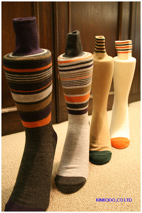 写真はディスプレイ用に着せたものですからカジュアルの色のはっきりしたソックスが並んでおりますが、私の場合はカジュアルとフォーマルの靴下の棚は別々になっております。朝頭の中で黒系でまとめていたつもりなのに、いざ出る時には茶系の靴を履いてでて、靴下が黒だったとか、色合いもそうですが、フォーマルな装いでちょっとカジュアル過ぎたとか、言う時はできるだけ足を組まずに靴下を見えないようにしたり。あってはいけないことですが、たまに失敗をしたりします。できれば前日に全て決めてから寝ればいいのですけどね。