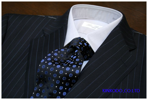 ダークネイビーのスーツにブルーのストライプ。このようなストライプのスーツって本当に最近増えましたが、実際のところ合わすネクタイは難しいものです。そこでこのようなドットの大きい柄と言いますか、小紋の大きめと言いますか、ストライプと柄が合わないような柄を選択します。全体の色合いはシックですが、織物ですから中のブルーが綺麗に光って見えます。色合いのコントラストは強くないのですが、非常に存在感のあるネクタイだと思います。