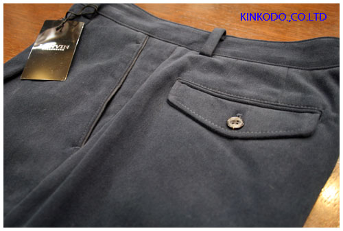 こんなのは如何でしょうか?綺麗系綿パン。最近は椅子での生活が多くなりましたし、そのまま家の床でゴロゴロすることがなければ、朝このパンツを履いて、そしてランチなどでちょっと洒落たところにも出かけていけます。綿パンと言っても夏場のベージュの薄いものをこの時期も引きずっている方も時々見かけますが、起毛された暖かみのある素材の綿パンですと秋の街にも映えるはずです。ポケット口にはパイピングもされており、ちょっとしたこだわりが、フロントにプリーツが一本入ってはいますが比較的スリムなシルエットになっております。