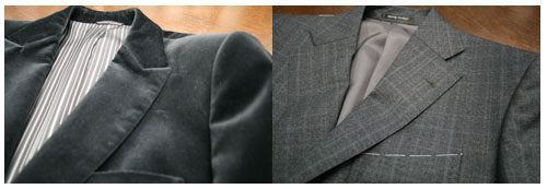 左がピークラベルで所謂衿の先が立ったデザイン。そして右がノッチラベルです。通常のシングルのスーツはほとんどがノッチラベルだと思います。右のベルベット素材のものは少しドレスアップしたい時、または最近の着方としては上はこのようなドレッシーな素材で下はジーンズを合わせてドレスダウンすることが多いですが、シングルのピークラベルは主にディレクターズスーツなどのフォーマルウェアに多いスタイルです。通常のシングルスーツですとこれがノッチラベルになります。またダブルのスーツの場合はこの逆にほとんどがピークラベルになります。