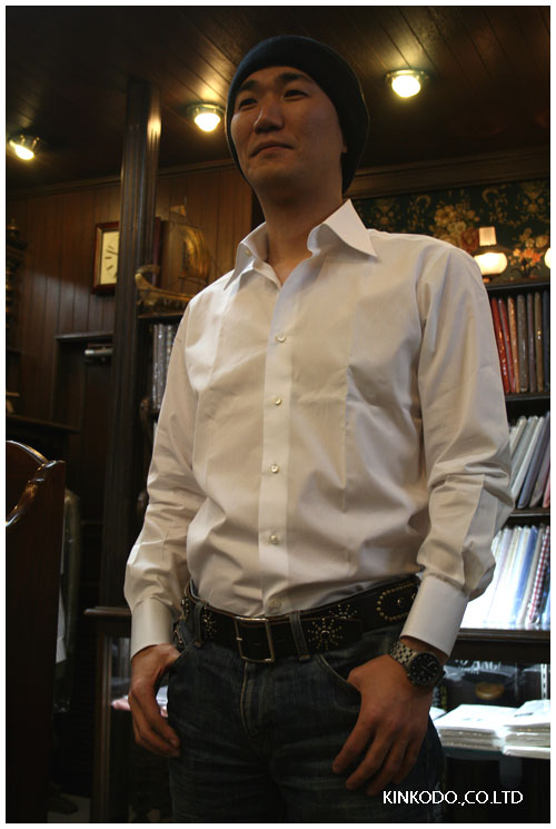 金沢の滞在時間わずか3時間40分。シャツや洋服の話は尽きることは無く、色々お話をさせて頂いて気付くとあっという間に時間が過ぎ、乗車予定の電車まで後30分。慌ててシャツの仕様を決めることになりました。わざわざ前回作って頂いたシャツを持ってきて頂き、ご着用後写真を撮らせて頂きました。お名前はM氏とさせて頂きます。M氏とシャツの話で盛り上がったのは白いシャツでいかに色気を演出するか?誤解があるといけないのですが、色気を感ずるのは男ではなくてシャツでございまして、当然そのシャツをご着用の方も色気があると言うことです。