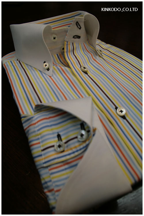 クレリックのボタンダウンで、衿裏は縞を使っております。同様にカフスはターンナップカフスの裏側が縞で、ボタンホールとボタン付け糸は焦げ茶で白蝶貝の4ミリ厚のボタンを使用して高級感を演出しております。