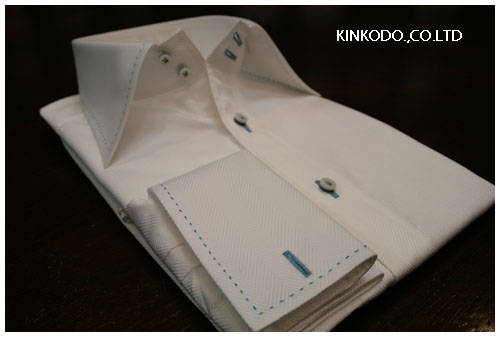 生地は白のヘリンボーン。ブルーのハンドステッチを衿とカフスにかけております。同色の色でボタンホール糸とボタン付け糸を施しております。当店のハンドステッチは本当のハンドステッチ、一針一針手で糸を這わせております。衿台は少し高めにし衿元を大胆に主張。