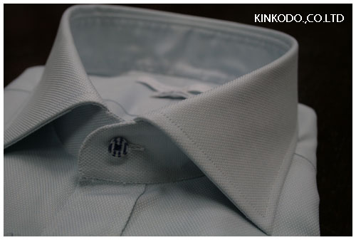 こちらのシャツ。衿元の第一ボタンに使っているぼたんですが、こちらはプラスチックボタンなのですが、ブルーのストライプのシャツ生地をボタンの間に挟んでボタンを作っております。シャツ自体はフォーマルな雰囲気を持ったシャツですが、ボタンはちょっとカジュアル。