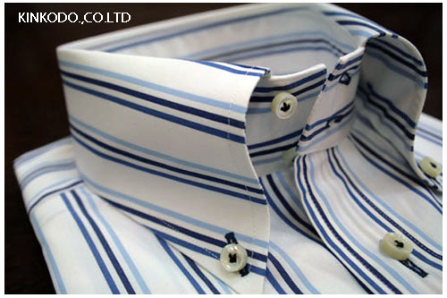 すっきりとしたブルーのストライプです。ボタンは厚いものを使用しておりますが、千鳥掛けにしとめやすいように。すっきりとしたシャツに仕上がっております。お客様はどのようなコーディネートでご着用になられるか分かりませんが、これからのシーズンにはぴったりのシャツですね。