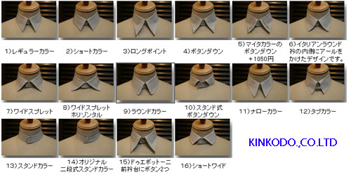 当店にはオーダーシャツの衿型の基本形が16通りあります。