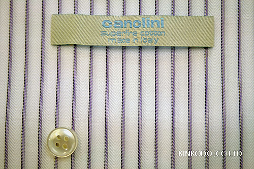 カンクリーニの120番手の高級素材。ヘリンボーン地にパープルのストライプ。120番の細い糸を使っていますが、テンションが高く、張りのある生地です。華美ではありませんがパープルの優しい色合いが色気も演出してくれることと思います。ボタンダウンにしボタン付け糸はパープル。白蝶貝を使って上品な印象に仕上げれば6月1日も胸を張って会社に出かけることができるかと思います。