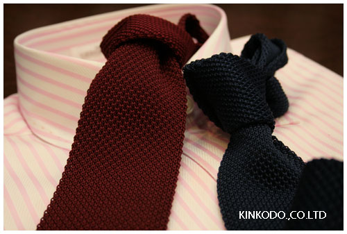 さてこちらは、ちょっとアクセントを付けたシルクのニットタイ、上のワインとネイビーのタイに比べれば若干タイの巾は太めで7.5センチ。これはネクタイの大剣の下の方にラインを付けてあるからだと思いますが、こちらも同様にカジュアルな雰囲気で衿元のアクセントに使って頂ければと思います。¥6,300-(中国製)