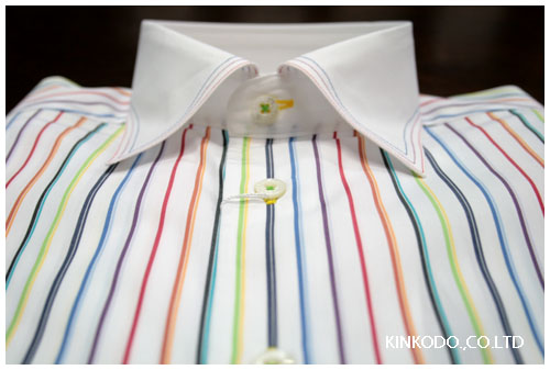 どうせなら派手派手で行こうぜ!思いっきりレインボーカラーに3色のステッチがあたったクレリックシャツ。結構刺激的です。