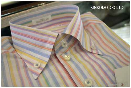 実際衿台の直ぐ下にボタンを付けることってあるのです。その場合は第一ボタンがこの位置で、衿台にはボタンは付けずに、ネクタイで衿をぎゅっと締めるような状態になるのです。時々ネクタイを締めても一番上のボタンはとめないという方がいらっしゃいますので、そういう方には前衿台からボタンを最初から外して、第一ボタンをボディの上の方。ちょうど写真のボタンをぽつんと置いてある位置。ただこれはネクタイをすると言うのが条件。