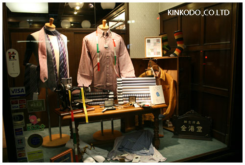 オーダーシャツ生地をメインに全体的にオーダーの雰囲気を演出し、カフスなどの小物も置きました。なかなかうまくできたと思っております。是非ご覧になって見てください。