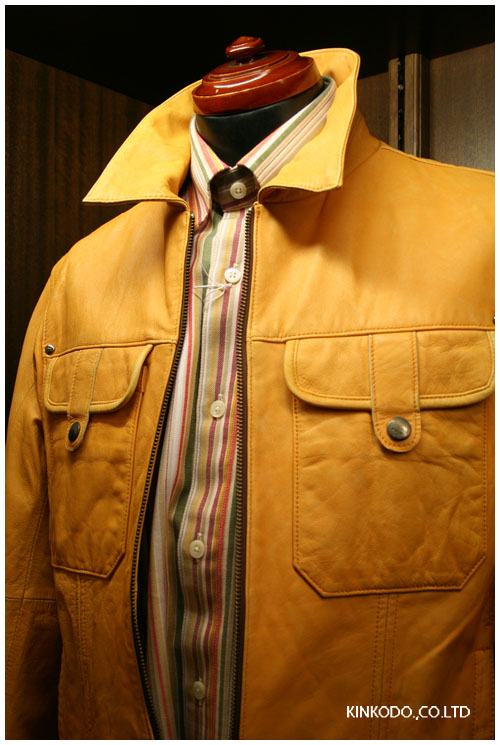 はい、これ着てたら交通事故にはあわないと思う。そういう問題ではなくて、黄色の洗いのかかったレザーのブルゾンです。もう黒や紺とかのダークな色合いは飽きられてきた感じがあります。あえて明るい色に今年は挑戦です。革ジャンですから目立たないと損ですよね。