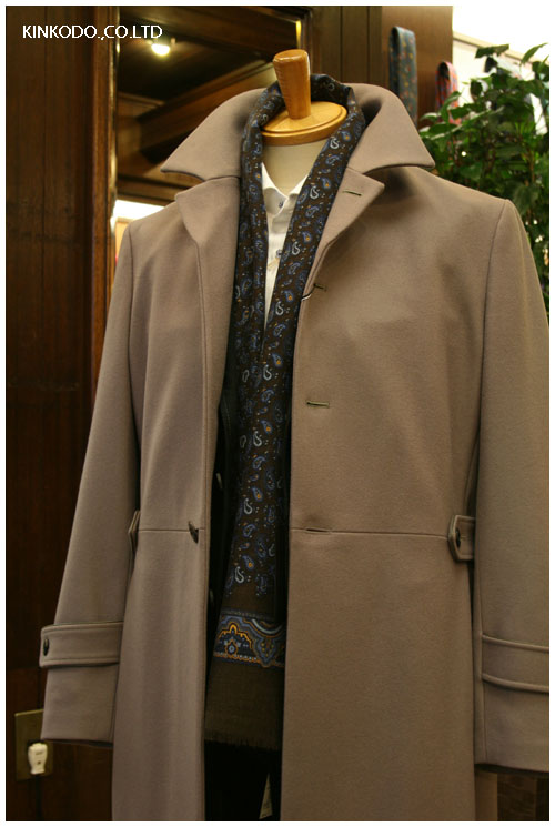 フェルト素材のコート。ウール75%ナイロン20%カシミヤ5%です。かなりクラッシックな仕立てになっておりまして、ボディーをセンターで継ぎその位置にバックベルト付き、センターベンツ、あえて衿にはステッチもなくすっきりと仕上げております。また色合いが絶妙です。マフラーも全体の雰囲気に合わせてカシミヤシルクのペイズリー柄で落ち着いてまとめました。