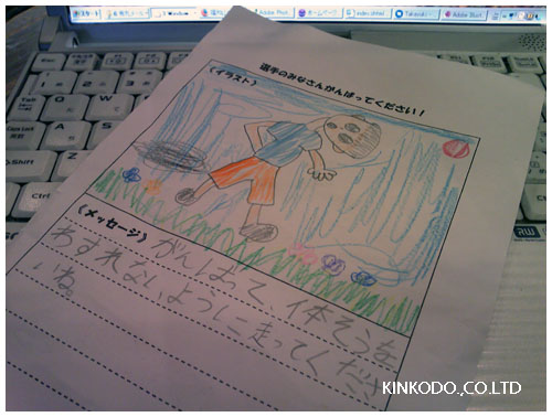地元の小学校の子供たちが選手のみんなに絵とコメントを書いてくれます。1万人以上いますから相当な枚数を一人が書くことになるのではないでしょうか?私が頂いたものには「がんばって、体そうをわすれないように走って下さいね」と。小学校2年生からのメッセージでした。ジムの他のメンバーには優勝してください(笑)と書いてあったとか。
