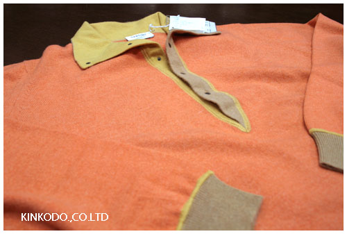 ベースは綺麗なオレンジ。そしてくすんだ黄色とベージュで襟元にアクセントを。小さいホックでとめてあります。一番上まで止めればハイネックのような感じ。